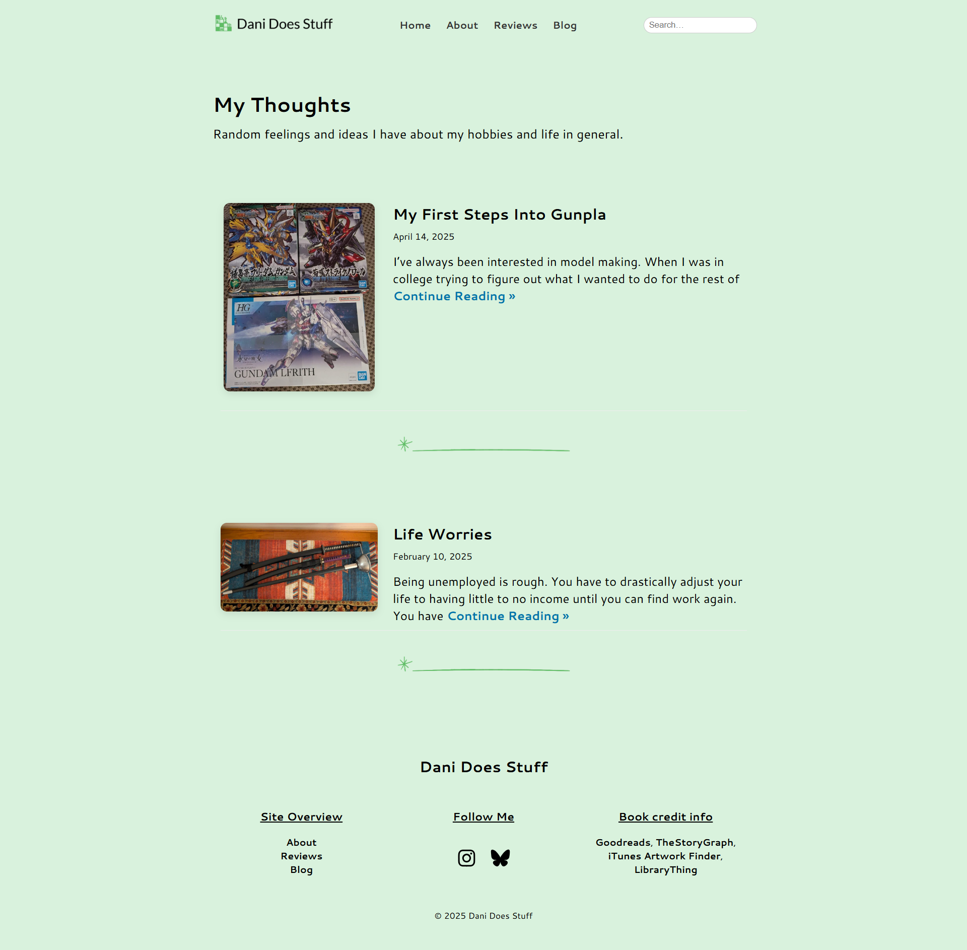 A general layout for my blog posts. My focus was more on the book reivews, but I wanted a place to show my other hobbies as well.
