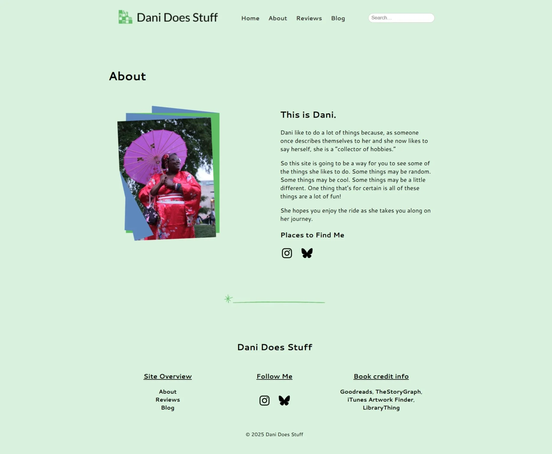 I wanted to keep my About page simple with a different image of myself, also created in Canva, a small section talking about myself, and social media links at the bottom of the description area. I think this was the easiest area to set up and the was a fast page to complete. The image is me cosplaying in one of my fashion kimono at an event at the Virginia Museum of Fine Arts. We were really lucky that day since the event ended right before it started severely raining. But before that, a lot of fun was had by all.